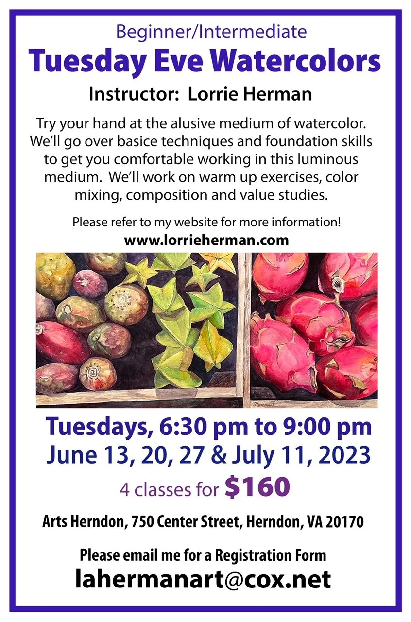 Tuesday Evening Watercolors (First Class) Tuesday, June 13, 2023 6:30 PM 9:00 PM Arts Herndon 750 Center Street Herndon, VA 20170 USA (map) Google Calendar ICS Tuesday Eve WatercolorsWith Lorrie HermanTry your hand at the allusive medium of watercolor. We’ll go over basic techniques and foundation skills to get you comfortable working in this luminous medium. We’ll work on warm up exercises, color mixing, composition, and value studies.Please refer to www.lorrieherman.com for more information.To receive your registration form please email lahermanart@cox.net.